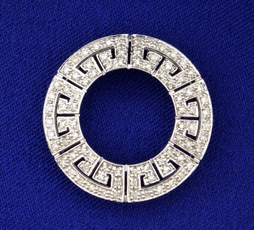 In 14K white gold, it is just over 1 inch in diameter. It contains eighty four 1/2pt round diamonds.       5.4g