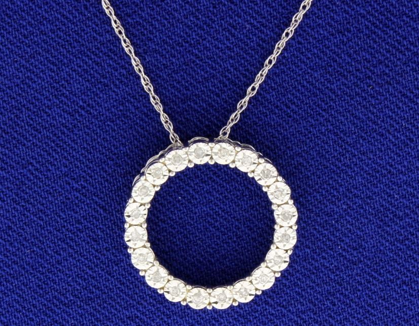 Beautiful and classic, this diamond circle pendant is set in 14k white gold and holds 21 diamonds, for a total of a 1/4 carat. The chain is 18" long and is also 14k white gold and new! 2.6g
