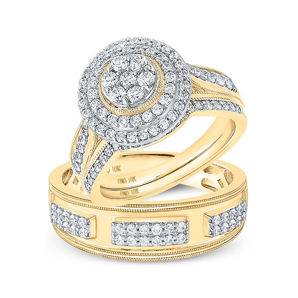 10kt Yellow Gold His Hers Round Diamond Cluster Matching Wedding Set 1-1/4 Cttw.