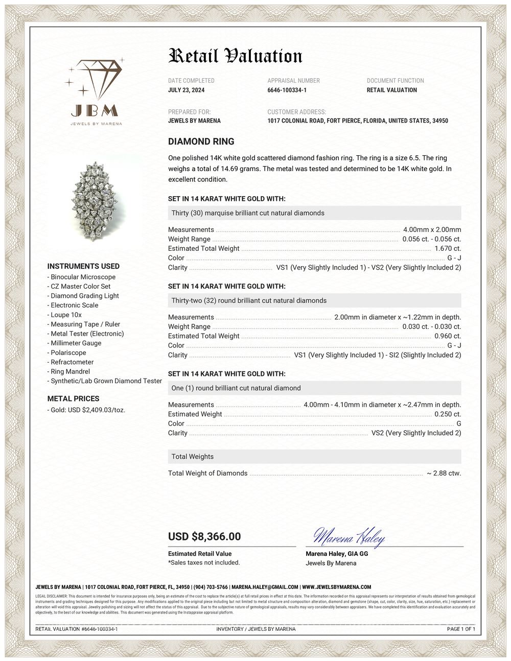 DESCRIPTION DETAIL: Scattered Diamond Statement Ring, 14K White Gold Setting. US Size 6.5
