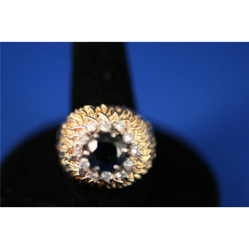 This is a classic and dramatic mid century cocktail ring. Textured 14K gold is topped by a sapphire of approximately 2.5 carats ringed by .36 cts of diamond. The ring is a size 6.75 (sizable by me or by your jeweler), weighs a hefty 8.4 grams and sits 5/8 of an inch above the finger.