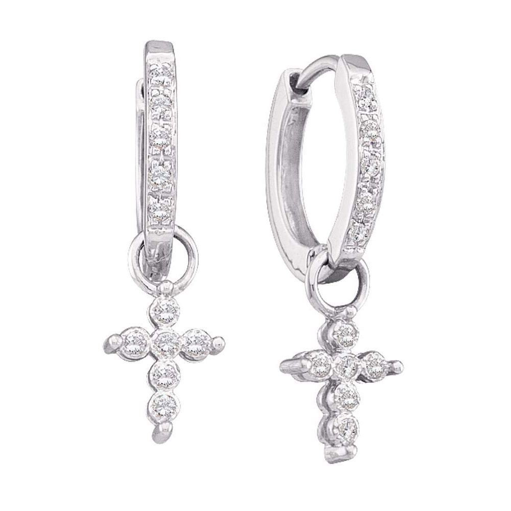 REF-16N4F - SKU: GD21546 ---- Diamond Cross Dangle Hoop Earrings 1/10 Cttw 10kt White Gold