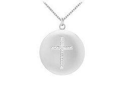 The holy cross is made with 11 brilliant-cut round diamonds on this sleek polished disc. Made in 14K white gold this pendant has a total diamond weight (TDW) of 0.10 ct.