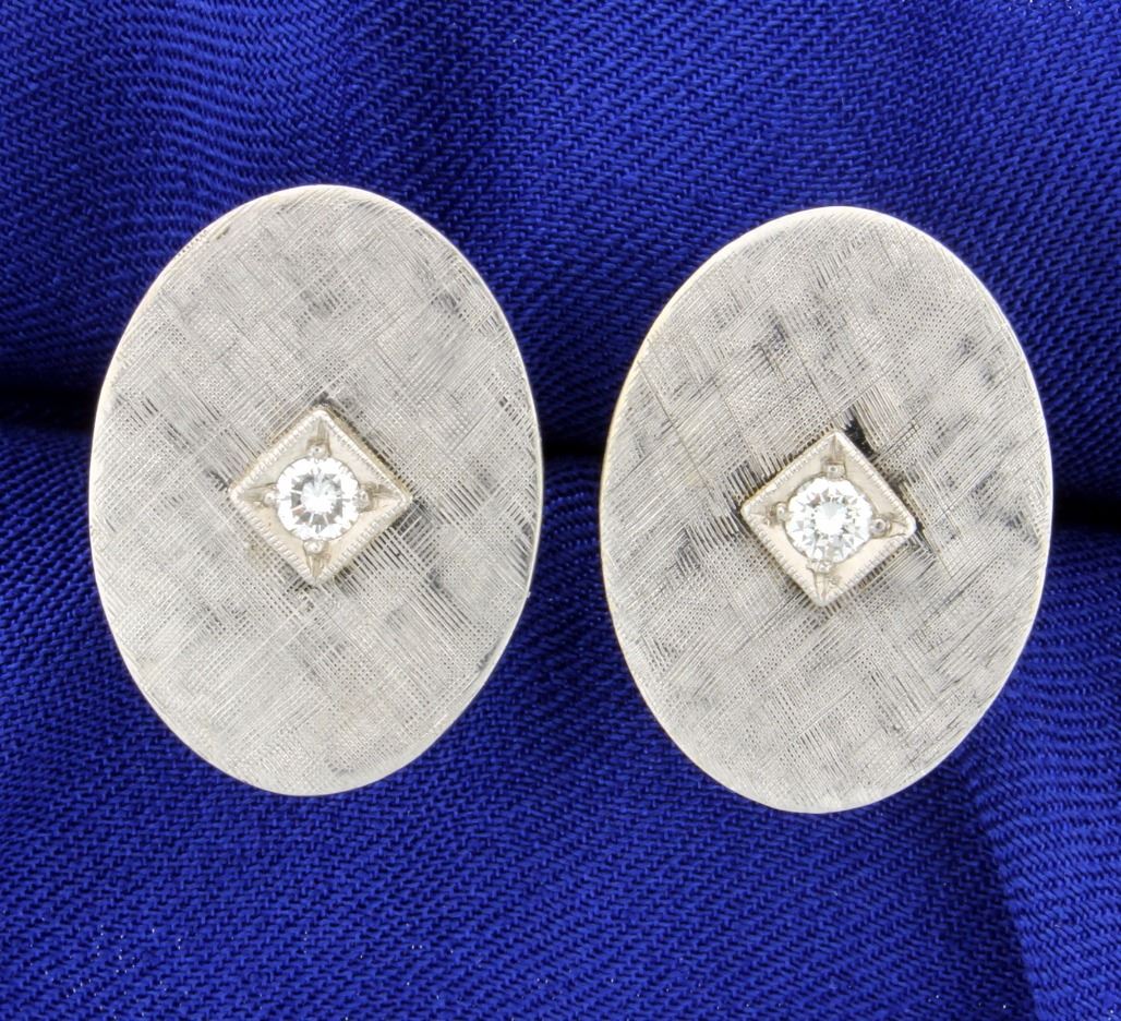 In 14K white gold, each cufflink contains one .10ct very high quality round diamond - VS clarity, G color. The face of the cufflinks is 7/8 inch long and 5/8 inch wide. 14.7g