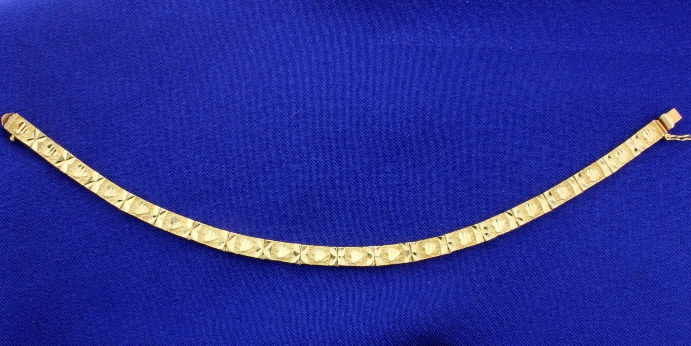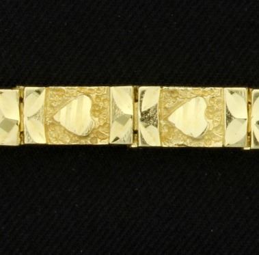 In 14k yellow gold. The bracelet is 7 1/4 inches long and 4.9mm wide. Beautifully detailed with hearts and a diamond cut pattern. It has a safety clasp. 12.0g