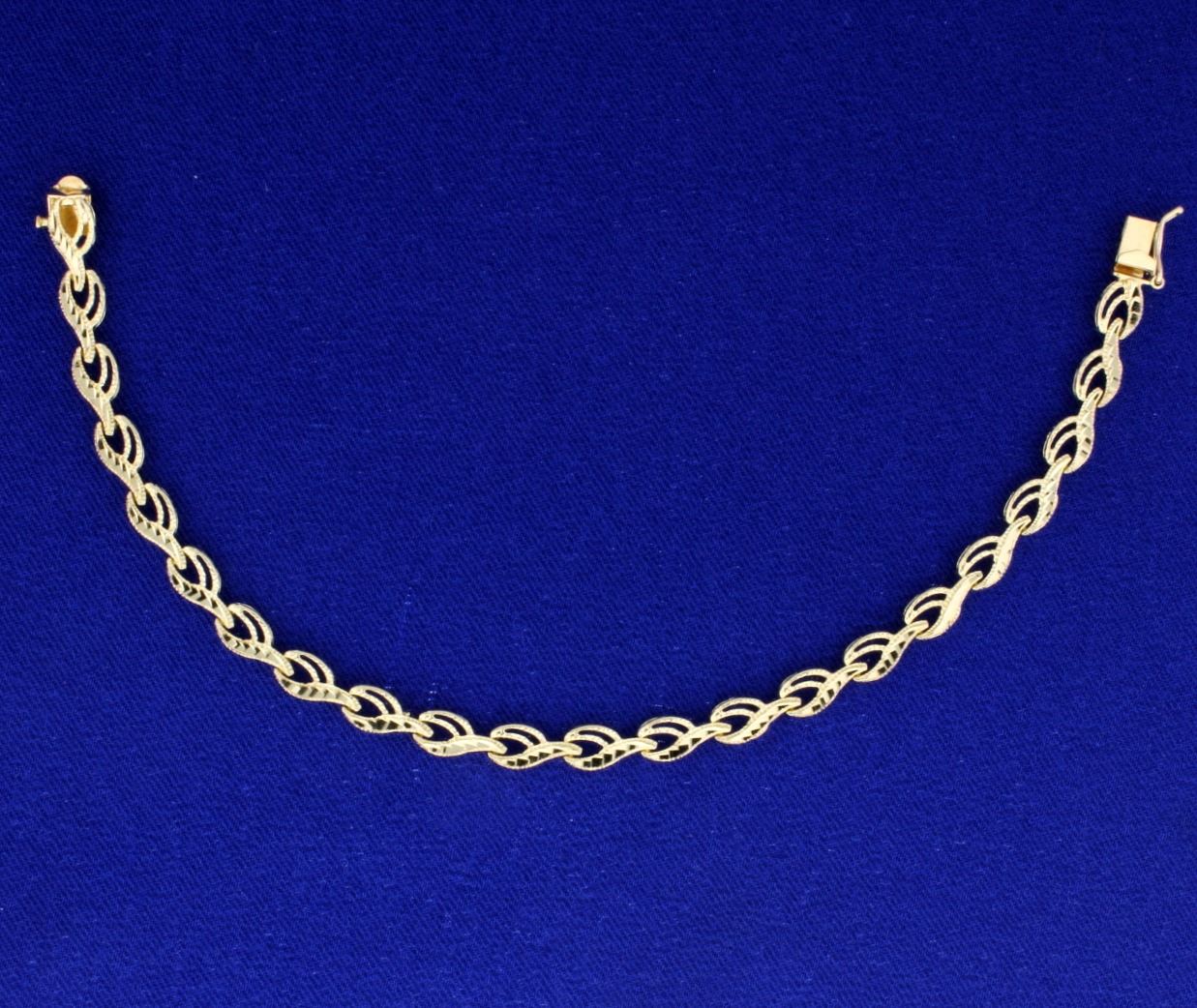 In 14k yellow gold. The bracelet is 7 1/4 inches long with diamond etching throughout, very beautifully designed bracelet. Has a safety clasp. 6.7g