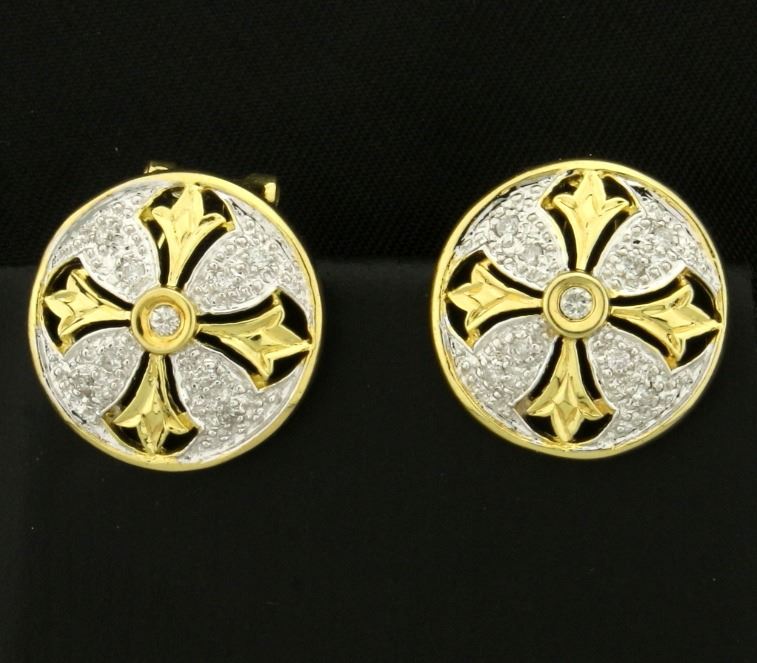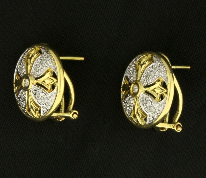 In 14k yellow and white gold. Each earring contains one .02ct high quality diamond and eight .005ct high quality diamonds. 1/2" diameter, with French back for pierced ears. 4.8g.