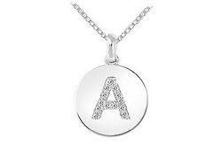 Beautifully made in polished 14K white gold disc pendant is inscribed with the letter "A". This alphabet is embellished with brilliant-cut round diamonds with a total gem weight (TDW) of 0.15 carat. This initial pendant dangling from standard 16 inches gold chain. Wear your identity symbol.