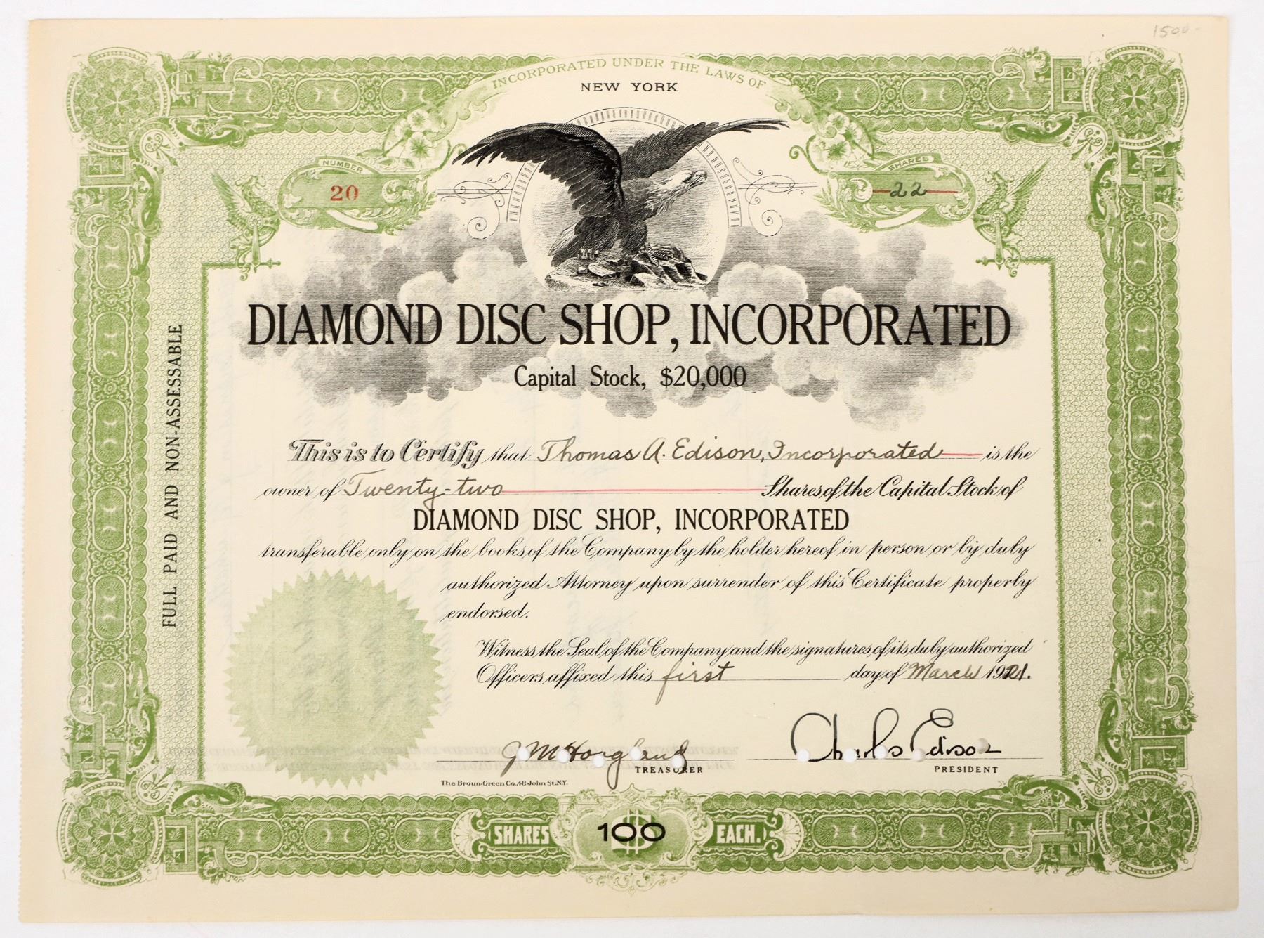 No. 20, issued to Thomas A. Edison, Incorporated, in 1921. Signed by Charles Edison as president. Punch cancelled signature. Reverse has shares transferred to the Phonograph Corporation of Manhattan. Charles Edison, son of Thomas Edison, was an American politician, businessman, inventor and animal behaviorist. He was the Assistant and then United States Secretary of the Navy, served as the 42nd Governor of New Jersey and was commonly known as "Lord Edison". Thomas Edison gave Charles the position of president of the Diamond Disc Shop, incorporated as soon as the company was organized to fill an important role in supplying records for the latest and greatest Edison phonograph, the Diamond Disc Phonograph, introduced in 1912. In the years just after World War I, Americans loved listening to music on their phonographs. The Edison Diamond Disc phonograph incorporated specially designed technology resulting in very little wear to records and superior sound quality with reduced surface noise. The records, or Diamond discs, were vertical cut, 10"s in diameter, 1/4" thick, and designed to play at 80 rpm; they held up to five minutes of recorded sound on each side, compared to 3 minutes for the 78rpm records from other companies that were popular at the time. Unfortunately, because Edison's discs, records and phonographs were not compatible with other manufacturers' products, the company's ability to compete was eventually limited. However, the quality of sound reproduction demonstrated with Edisons disc technology was far superior as Edison was the acknowledged master of the art of acoustical recording. This certificate was issued when Thomas Edison's Diamond Disc Phonograph Company was at its peak of production. It was offered in a variety of models from late 1912 to 1927, and the records or "Diamond Discs" were sold until October 1929, when the company finally closed its doors, just days before the stock market crash.