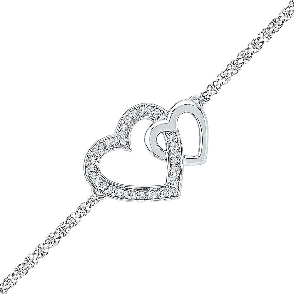 Sterling Silver Womens Round Diamond Double Heart Chain Bracelet 1/10 Cttw