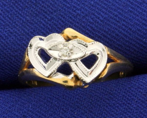 Beautiful 10k yellow gold ring with 10k white gold double hearts set at the top with a single high quality diamond set at the center that weighs approximately 0.01 carats. Size 6.5. 3.0g