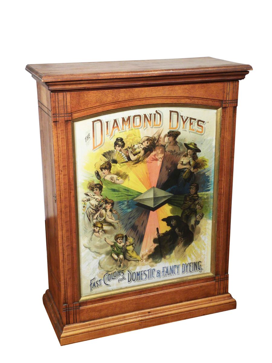 Diamond Dye Cabinet, Evolution of a Woman, A few minor scratches to the front tin door otherwise very good condition. Approx. 22 X 30 X 10 inches.