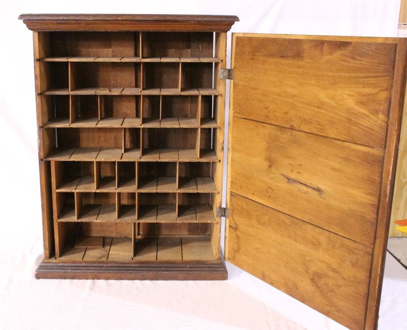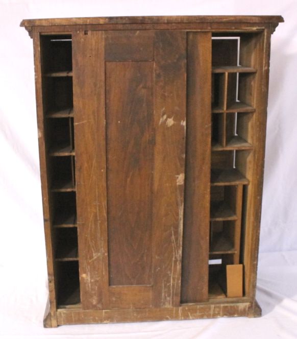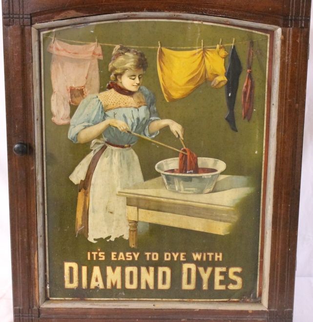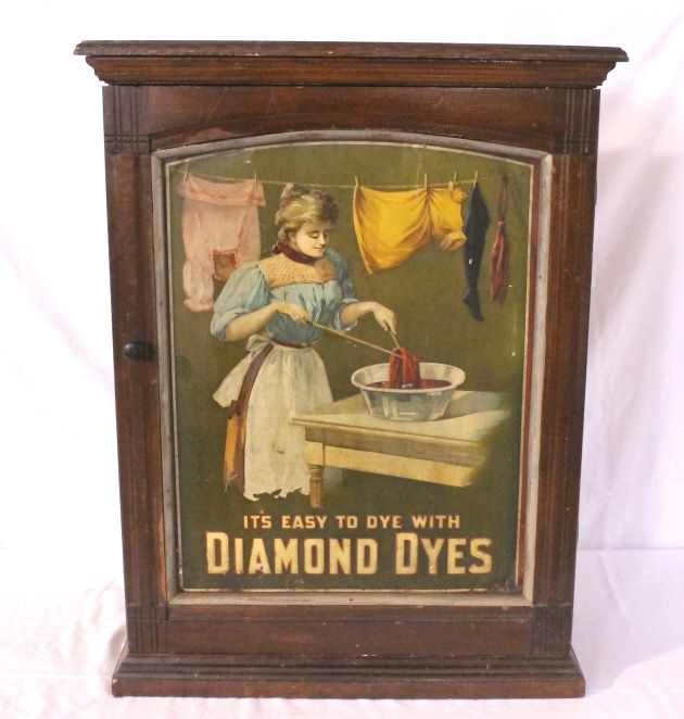 With great tin litho front. Super graphics of lady dyeing clothes. Has sliding doors in the back for restocking purposes. 10" x 23" x 30"
