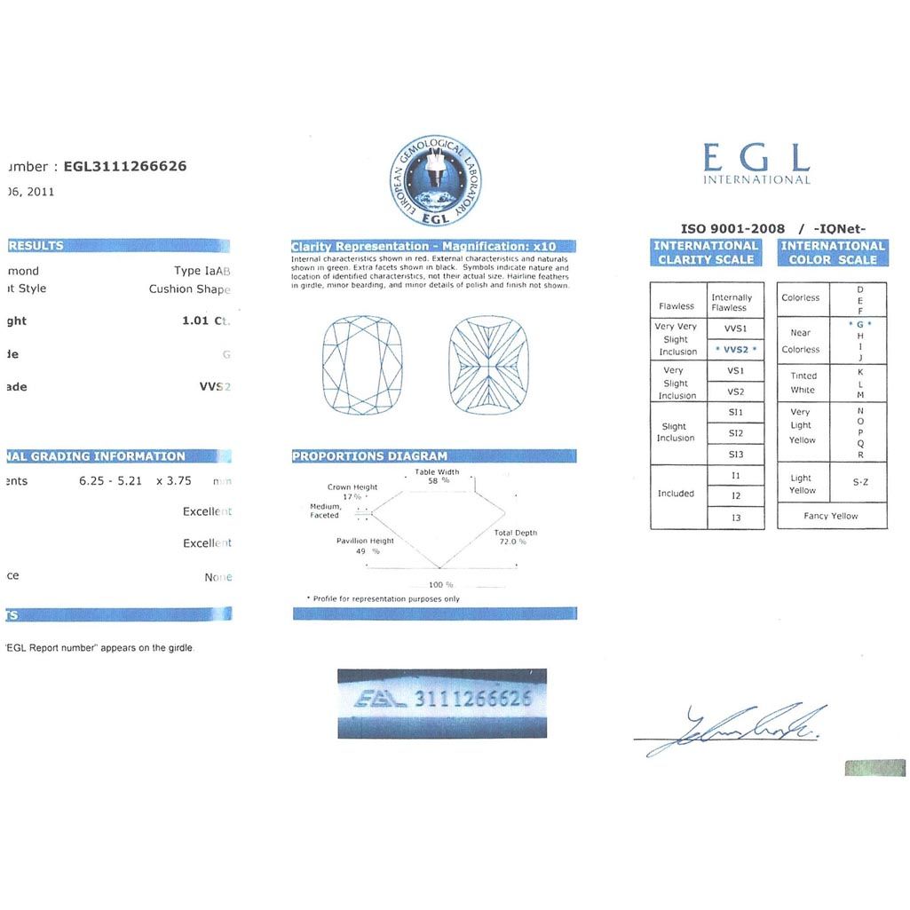 Diamond EGL Cert. Cushion 1.01 ct G, VVS2 **|**|** 6.25-5.21x3.75mm;Cut Excellent; Polish Excellent; Symmetry Excellent; Fluo None; Depth 72.0%; table 58% ; MSRP: $12000