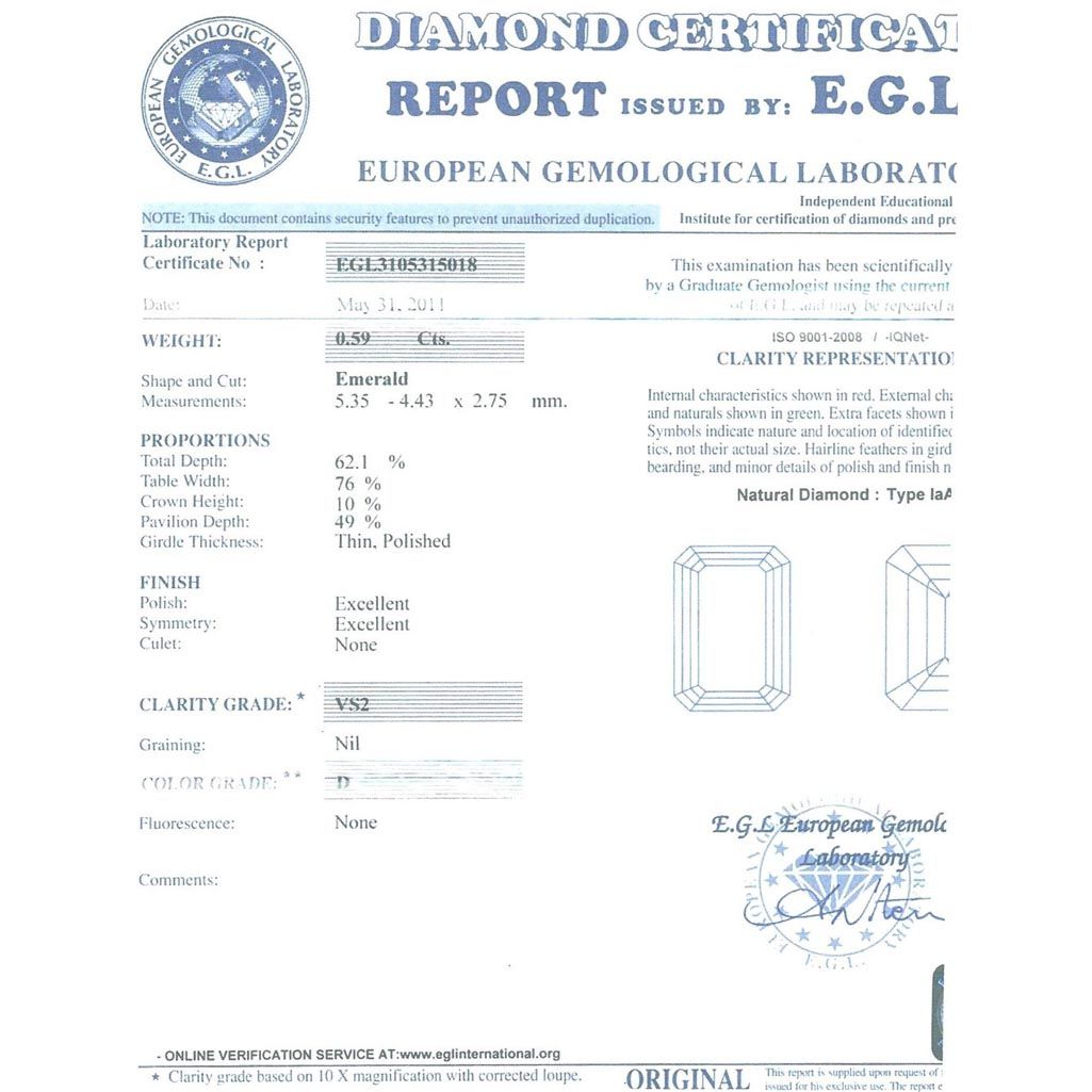Diamond EGL Cert. Emerald 0.59 ctw D, VS2 **|**|** 5.35-4.43x2.75mm;Cut Excellent; Polish Excellent; Symmetry Excellent; Fluo None; Depth 62.1%; table 76% ; MSRP: $6664