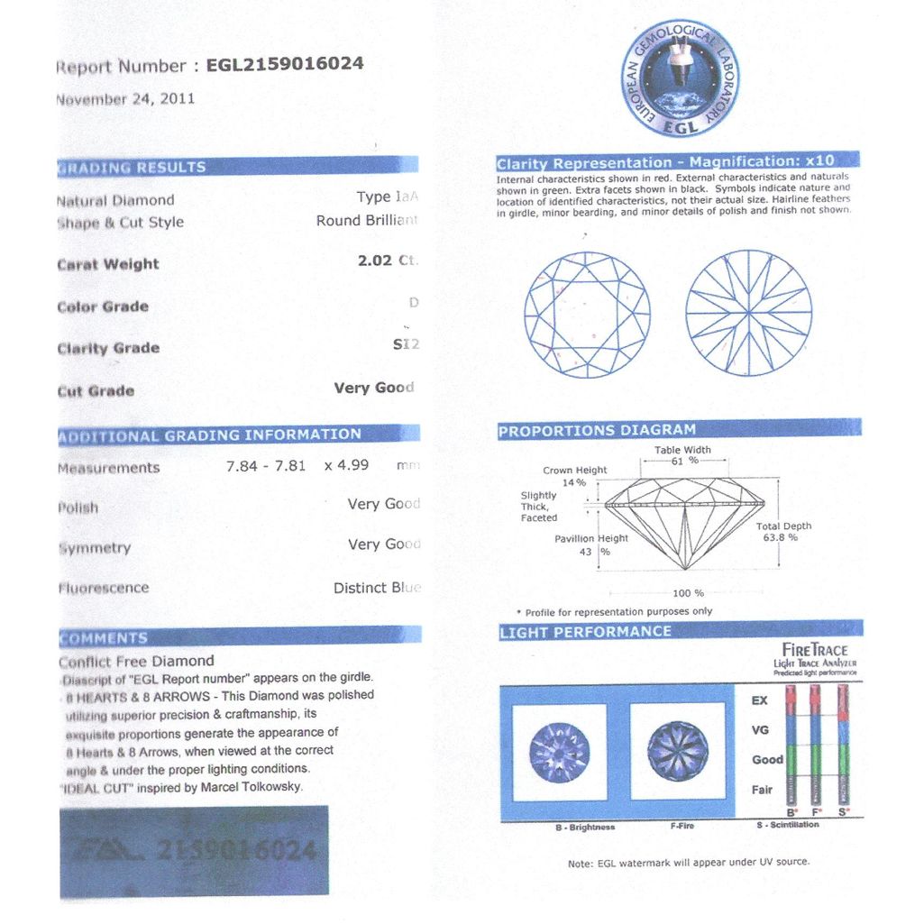 Diamond EGL Cert. ID: 2159016024 Round 2.02 ctw D, SI2 **|**|** 7.84-7.81x4.99mm;Cut Very Good; Polish Very Good; Symmetry Very Good; Fluo Distinct Blue; Depth 63.5%; table 60% ; MSRP: $32200