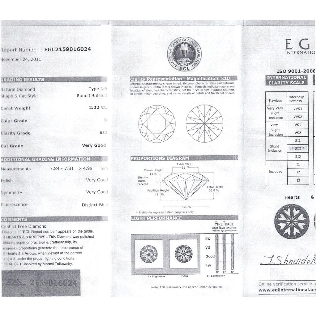 Diamond EGL Cert. ID: 215901624 Round 2.02 ctw D, SI2 **|**|** 7.84-7.81x4.99mm;Cut Very Good; Polish Very Good; Symmetry Very Good; Fluo Distinct Blue; Depth 63.8%; table 61% ; MSRP: $29000