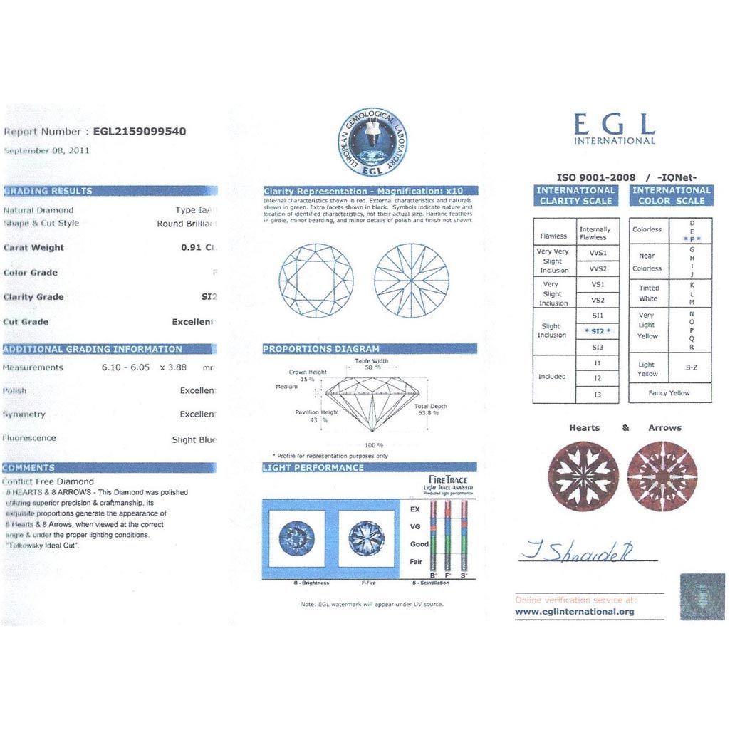 Diamond EGL Cert. ID:2159099540 Round 0.91 ctw F, Si2 **|**|** 6.10-6.05x3.88mm;Cut Excellent; Polish Excellent; Symmetry Excellent; Fluo Slight Blue; Depth 63.8%; table 58% ; MSRP: $10000