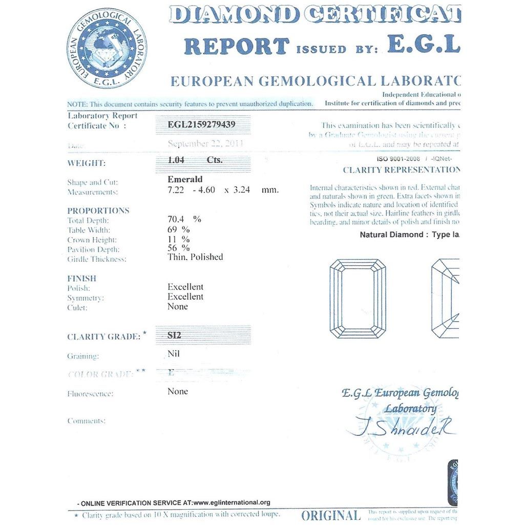 Diamond EGL Cert. ID:2159279439 Emerald 1.04 ctw E, Si2 **|**|** 7.22-4.60x3.24mm;Cut Excellent; Polish Excellent; Symmetry Excellent; Fluo None; Depth 70.4%; table 69% ; MSRP: $8000