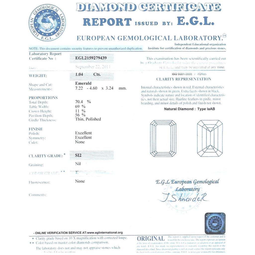 Diamond EGL Cert. ID:2159279439 Emerald 1.04 ctw E, Si2 **|**|** 7.22-4.60x3.24mm;Cut Excellent; Polish Excellent; Symmetry Excellent; Fluo None; Depth 70.4%; table 69% ; MSRP: $8000