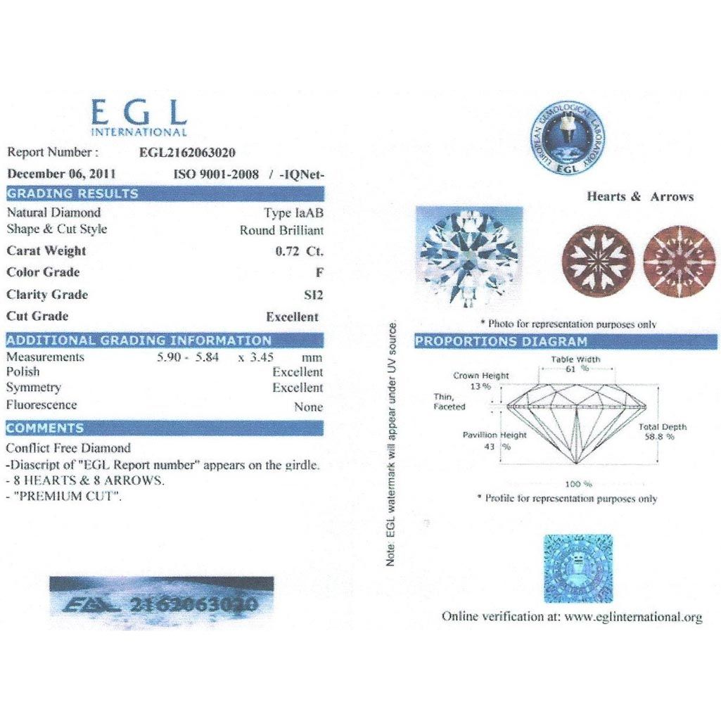 Diamond EGL Cert. ID:2162063020 Round 0.72 ctw F, Si2 **|**|** 5.90-5.84x3.45mm;Cut Excellent; Polish Excellent; Symmetry Excellent; Fluo None; Depth 58.8%; table 61% ; MSRP: $7000