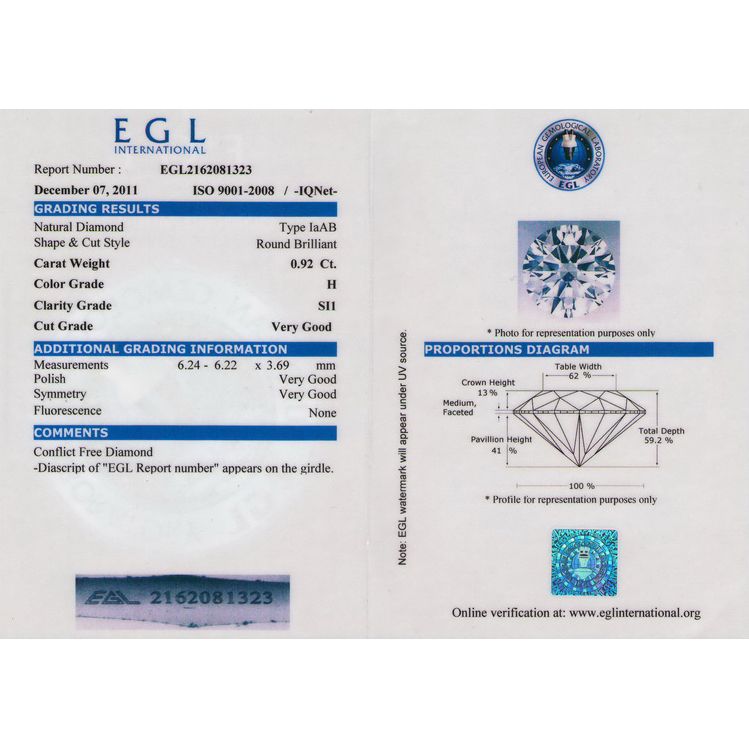 Diamond EGL Cert. ID: 2162081323 Round 0.92 ctw H, SI1 **|**|** 6.24-6.22x3.69mm;Cut Very Good; Polish Very Good; Symmetry Very Good; Fluo None; Depth 59.2%; table 62% ; MSRP: $8100