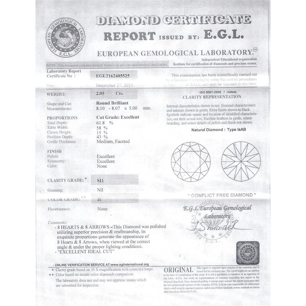 Diamond EGL Cert. ID: 2162405525 Round 2.05 ctw H, SI1 **|**|** 8.10-8.07x5.00mm;Cut Excellent; Polish Excellent; Symmetry Excellent; Fluo None; Depth 61.8%; table58% ; MSRP: $33000