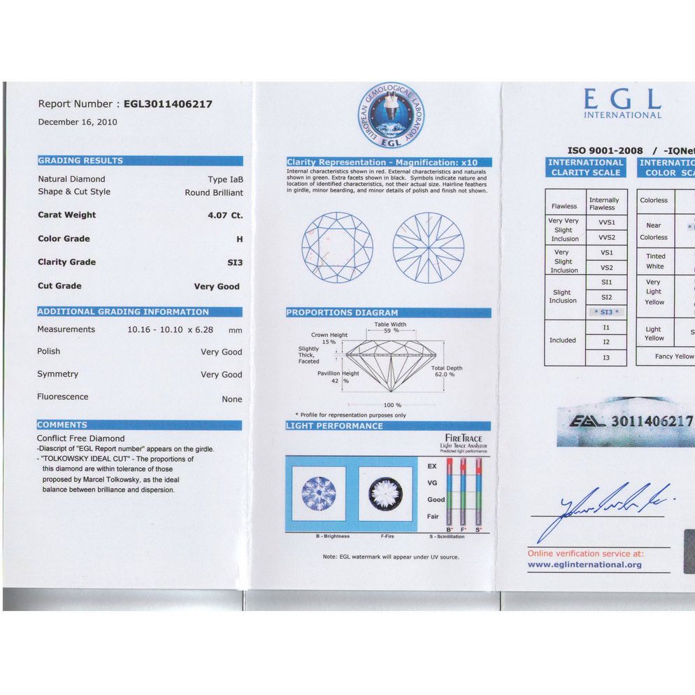 Diamond EGL Cert. ID: 3011406217 Round 4.07 ctw H, SI3 **|**|** 10.16-10.10x6.28mm;Cut Very Good; Polish Very Good; Symmetry Very Good; Fluo None; Depth 62.00%; table 59% ; MSRP: $48000