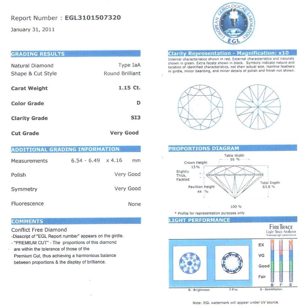 Diamond EGL Cert. ID:3101507320 Round 1.15 ctw D, Si3 **|**|** 6.80-6.77x3.79mm;Cut Very Good; Polish Very Goodt; Symmetry Very Good; Fluo None; Depth 56%; table 62% ; MSRP: $11000