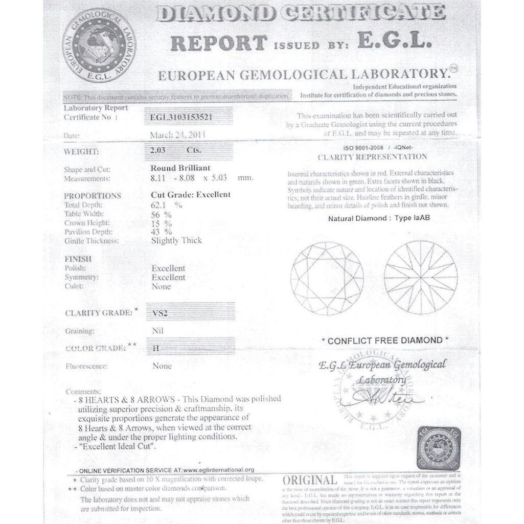 Diamond EGL Cert. ID: 3103153521 Round 2.03 ctw H, VS2 **|**|** 8.11-8.08x5.03mm;Cut Excellent; Polish Excellent; Symmetry Excellent; Fluo None; Depth 62.1%; table56% ; MSRP: $35400