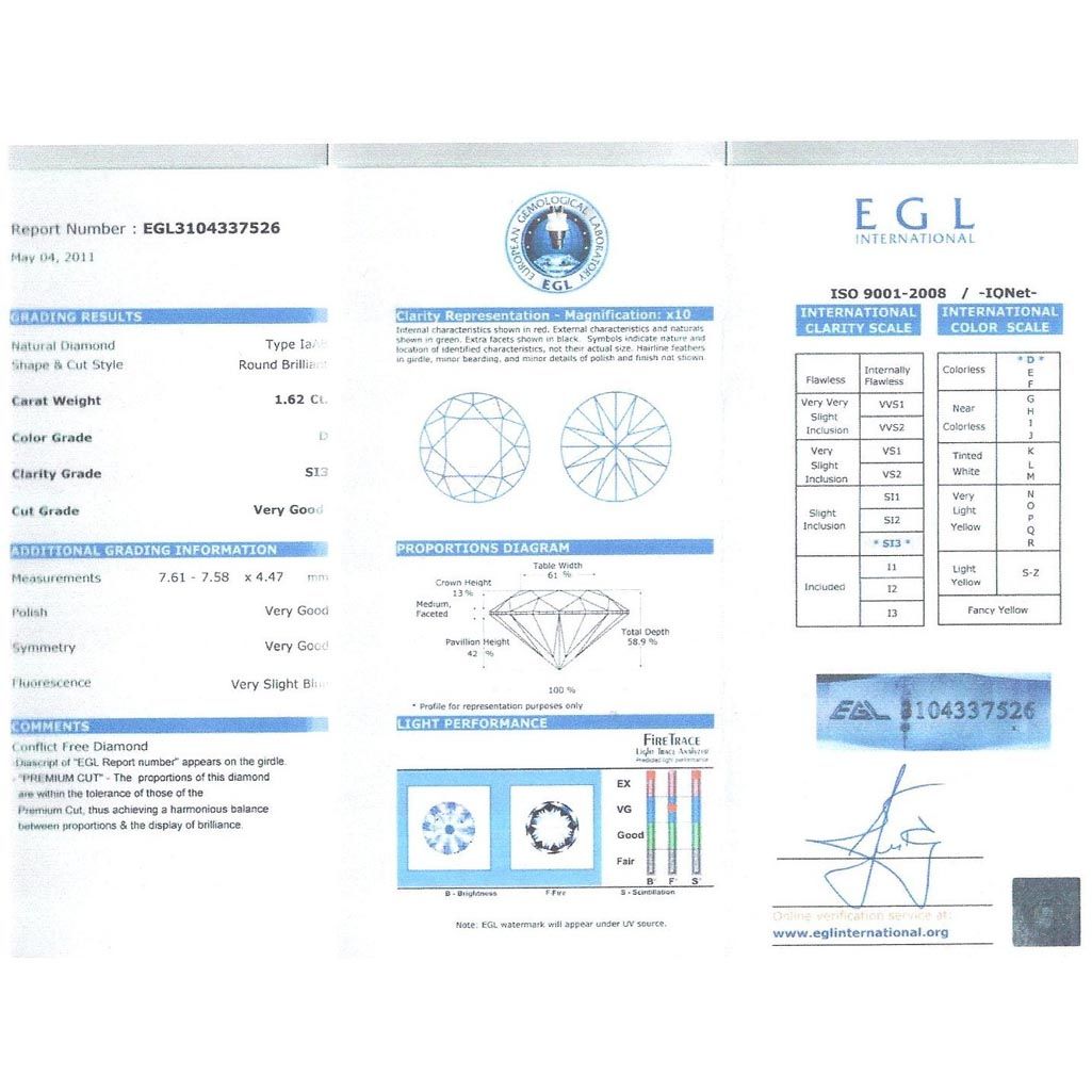 Diamond EGL Cert. ID:3104337526 Round 1.62 ctw D, Si3 **|**|** 7.61-7.58x4.47mm;Cut Very Good; Polish Very Goodt; Symmetry Very Good; Fluo VerySlight Blue; Depth 58.9%; table 61% ; MSRP: $13000
