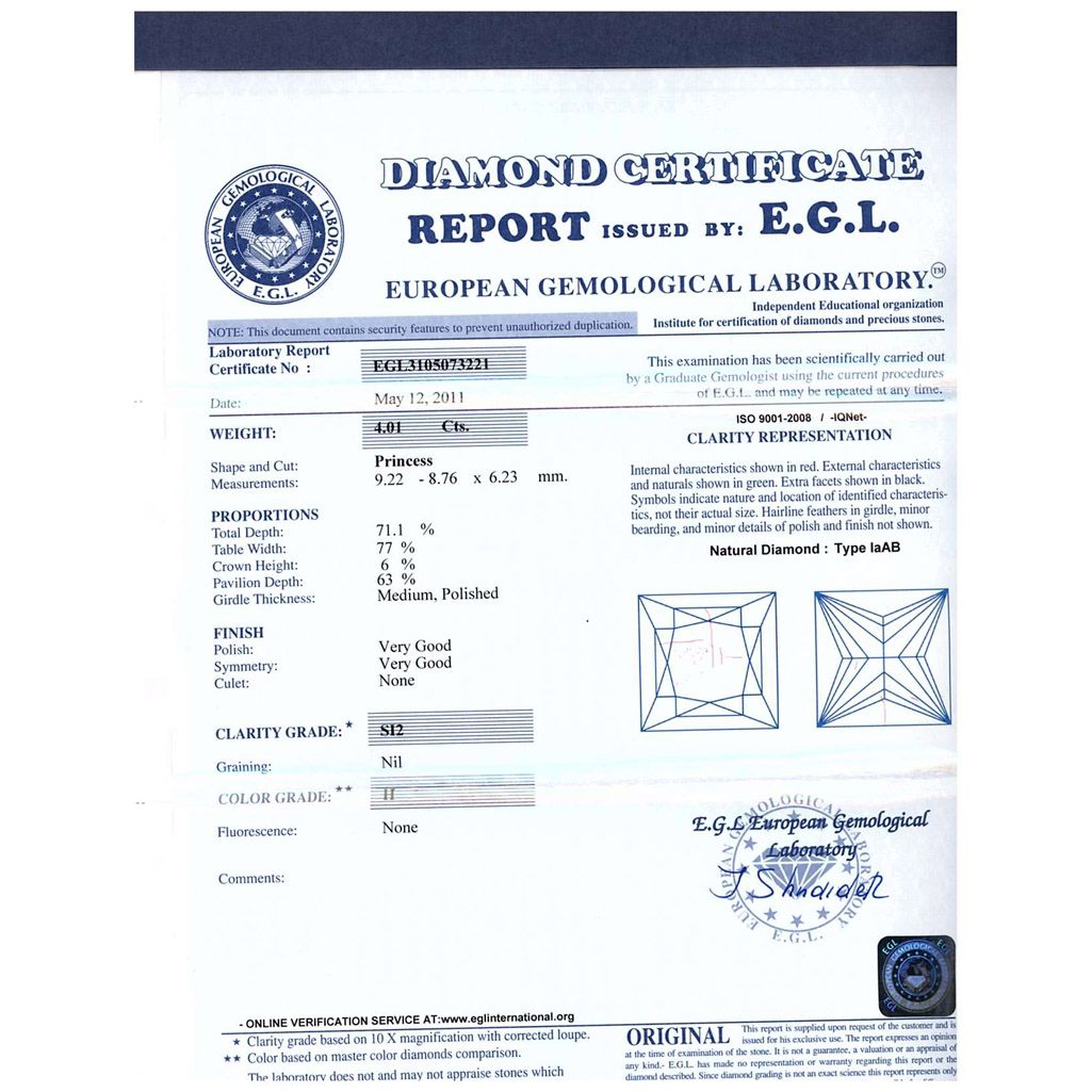 Diamond EGL Cert. ID: 3105073221 Round 4.01 ctw H, SI2 **|**|** 9.22-8.76x6.23mm;Cut Very Good; Polish Very Good; Symmetry Very Good; Fluo None; Depth 71.1%; table 77% ; MSRP: $75000