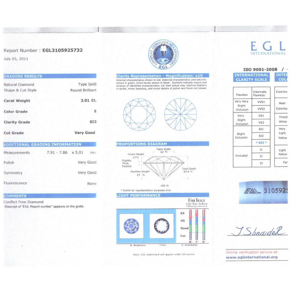 Diamond EGL Cert. ID: 3105925732 Round 2.01 ctw E, SI3 **|**|** 7.91-7.86x5.01mm;Cut Very Good; Polish Very Good; Symmetry Very Good; Fluo None; Depth 63.6%; table 63% ; MSRP: $22500