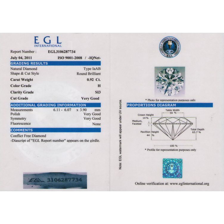 Diamond EGL Cert. ID: 3106287734 Round 0.92 ctw H, SI3 **|**|** 6.11-6.07x3.90mm;Cut Very Good; Polish Very Good; Symmetry Very Good; Fluo None; Depth 63.7%; table 59% ; MSRP: $6500