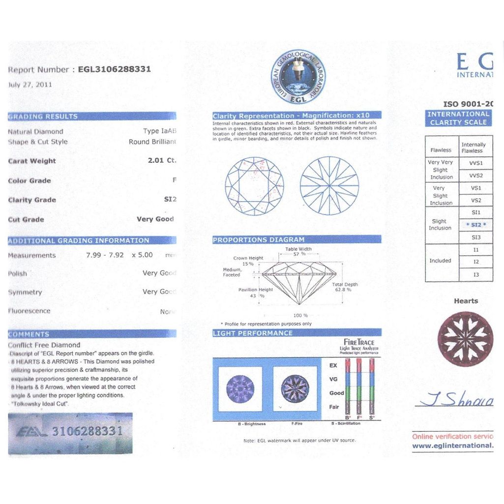 Diamond EGL Cert. ID: 3106288331 Round 2.01 ctw F, SI2 **|**|** 7.99-7.92x5.00mm;Cut Very Good; Polish Very Good; Symmetry Very Good; Fluo None; Depth 62.8%; table 57% ; MSRP: $30500