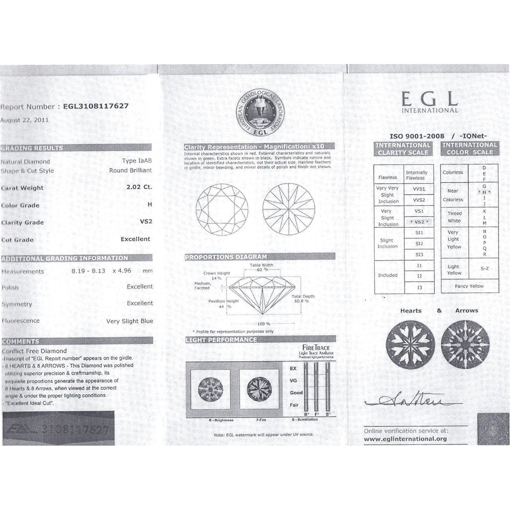 Diamond EGL Cert. ID: 3108117627 Round 2.02 ctw H, VS2 **|**|** 8.19-8.13x4.96mm;Cut Excellent; Polish Excellent; Symmetry Excellent; Fluo Very Slight Blue; Depth 60.8%; table60% ; MSRP: $36000