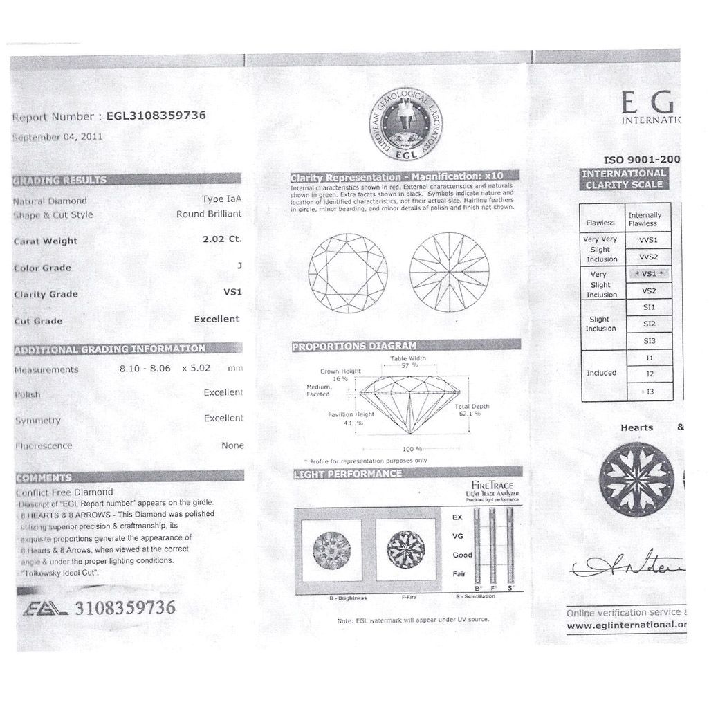 Diamond EGL Cert. ID: 3108359736 Round 2.02 ctw J, VS1 **|**|** 8.10-8.06x5.02mm;Cut Excellent; Polish Excellent; Symmetry Excellent; Fluo None; Depth 62.1%; table 57% ; MSRP: $20000