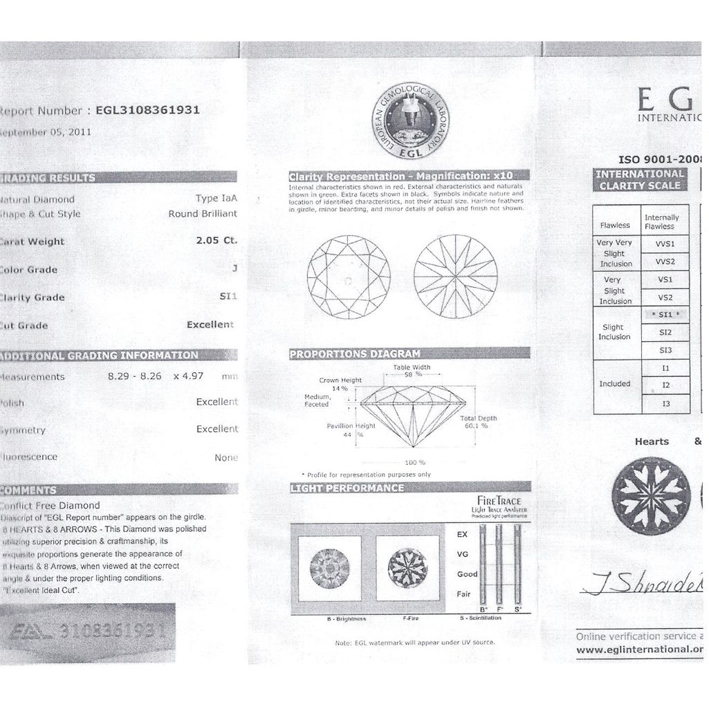 Diamond EGL Cert. ID: 3108361931 Round 2.05 ctw J, SI1 **|**|** 8.29-8.26x4.97mm;Cut Excellent; Polish Excellent; Symmetry Excellent; Fluo None; Depth 60.1%; table 58% ; MSRP: $19600