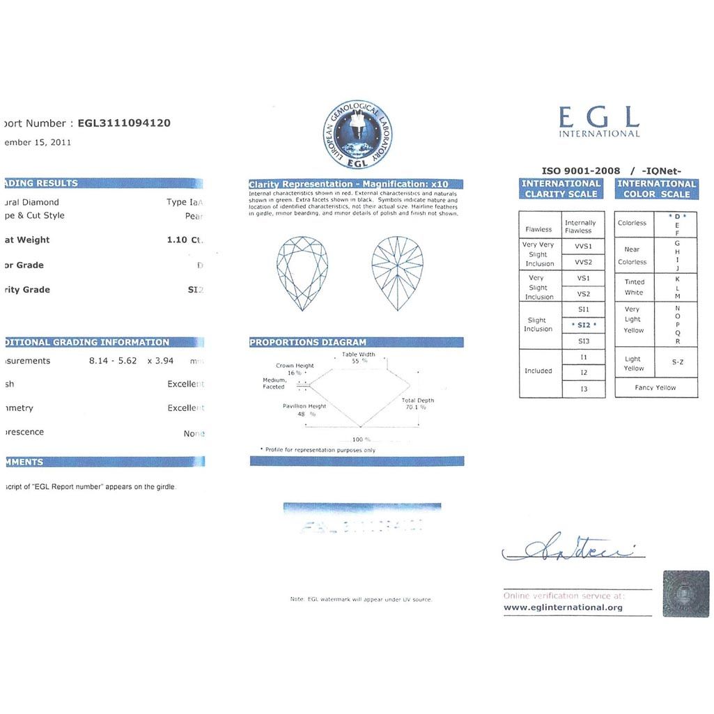 Diamond EGL Cert. ID:3111094120 Pear 1.10 ctw D, Si2 **|**|** 8.14-5.62x3.94mm;Cut Excellent; Polish Excellent; Symmetry Excellent; Fluo None; Depth 70.1%; table 55% ; MSRP: $12000