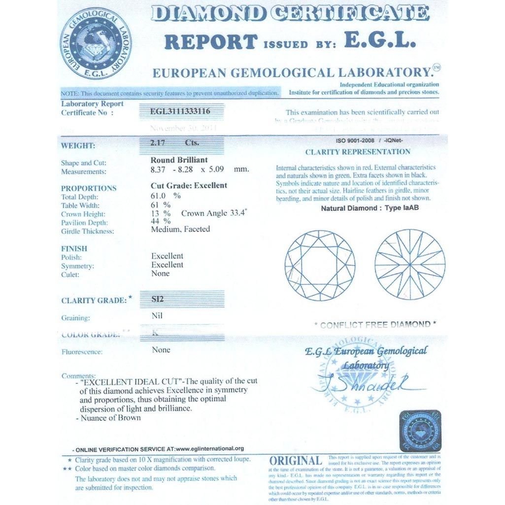 Diamond EGL Cert. ID:3111333116 Round 2.17 ctw K, Si2 **|**|** 8.37-8.28x5.09mm;Cut Excellent; Polish Excellent; Symmetry Excellent; Fluo None; Depth 61%; table 61% ; MSRP: $20000