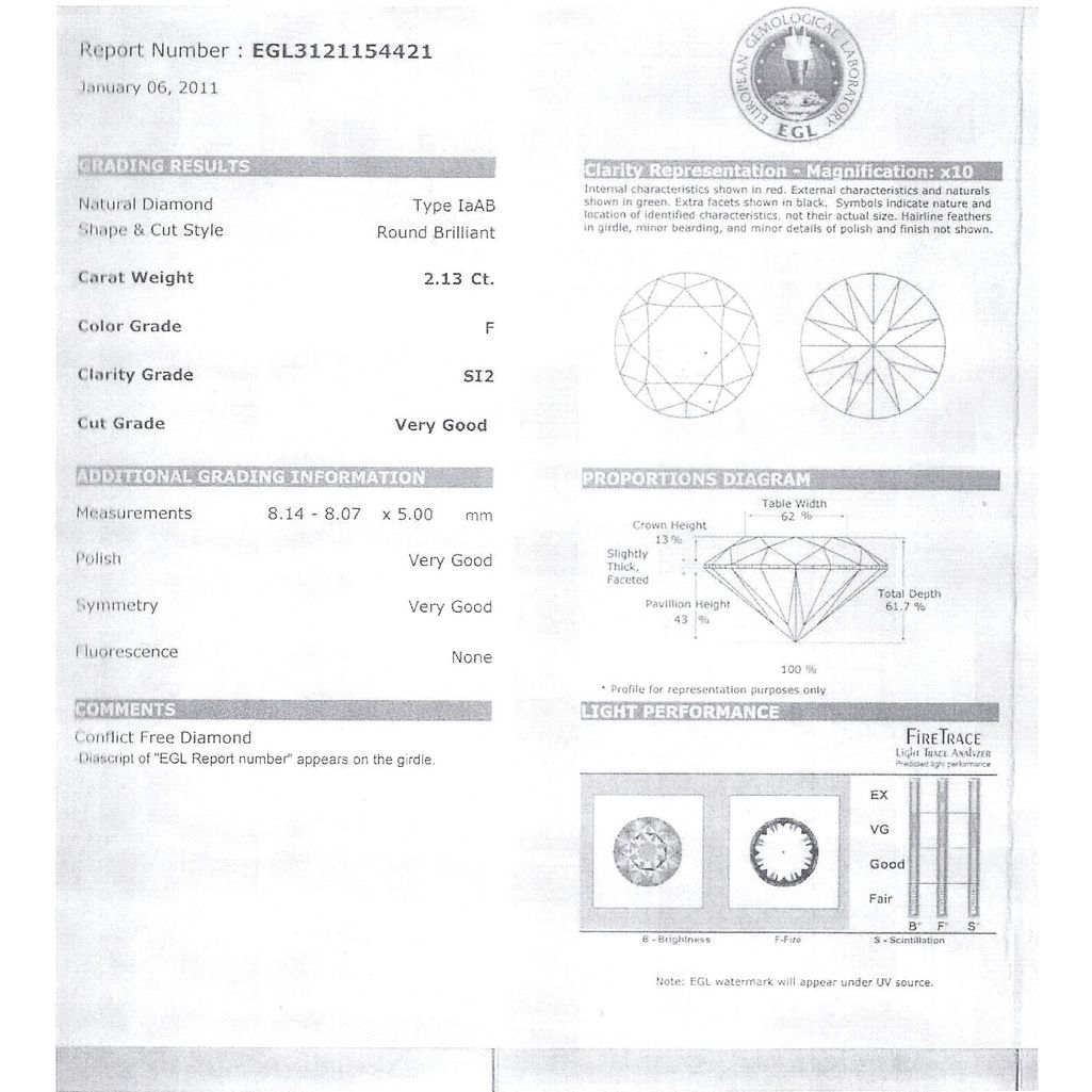 Diamond EGL Cert. ID: 3121154421 Round 2.13 ctw F, SI2 **|**|** 8.14-8.07x5.00mm;Cut Very Good; Polish Very Good; Symmetry Very Good; Fluo None; Depth 61.7%; table 62% ; MSRP: $23000