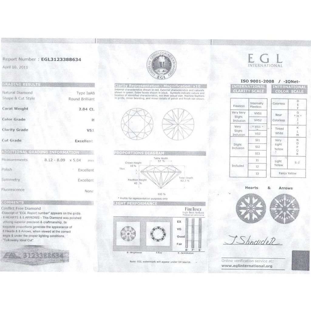 Diamond EGL Cert. ID: 3123388634 Round 2.04 ctw H, VS1 **|**|** 8.12-8.09x5.04mm;Cut Excellent; Polish Excellent; Symmetry Excellent; Fluo None; Depth 62.3%; table57% ; MSRP: $39000