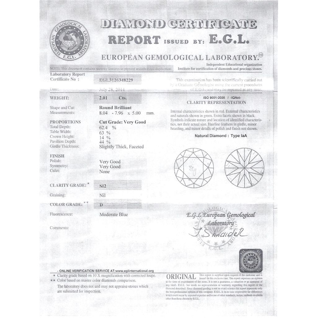 Diamond EGL Cert. ID: 3126348229 Round 2.01 ctw D, SI2 **|**|** 8.04-7.96x5.00mm;Cut Very Good; Polish Very Good; Symmetry Very Good; Fluo Moderate Blue; Depth 62.4%; table 63% ; MSRP: $48000