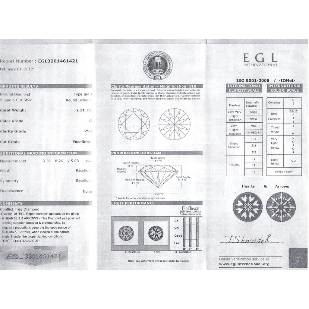 Diamond EGL Cert. ID: 3201461421 Round 2.11 ctw G, VS2 **|**|** 8.36-8.26x5.08mm;Cut Excellent; Polish Excellent; Symmetry Excellent; Fluo None; Depth 61.2%; table57% ; MSRP: $42000