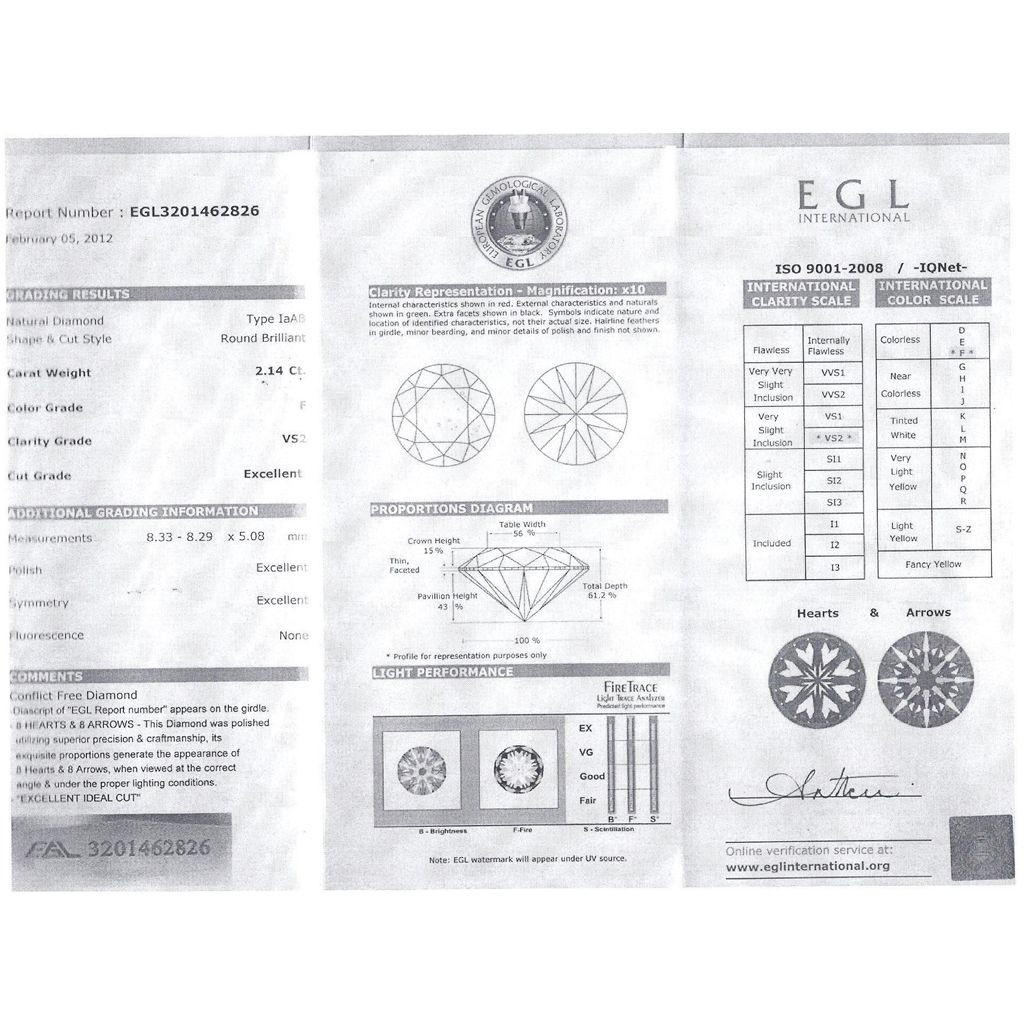 Diamond EGL Cert. ID: 3201762826 Round 2.14 ctw F, VS2 **|**|** 8.33-8.29x5.08mm;Cut Excellent; Polish Excellent; Symmetry Excellent; Fluo None; Depth 61.2%; table56% ; MSRP: $36500