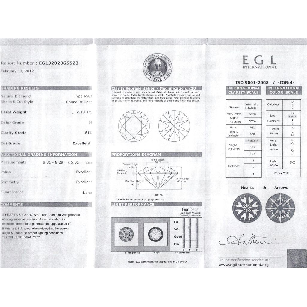 Diamond EGL Cert. ID: 3202065523 Round 2.17 ctw H, SI1 **|**|** 8.31-8.29x5.01mm;Cut Excellent; Polish Excellent; Symmetry Excellent; Fluo Very Slight; Depth 60.4%; table 60% ; MSRP: $28000