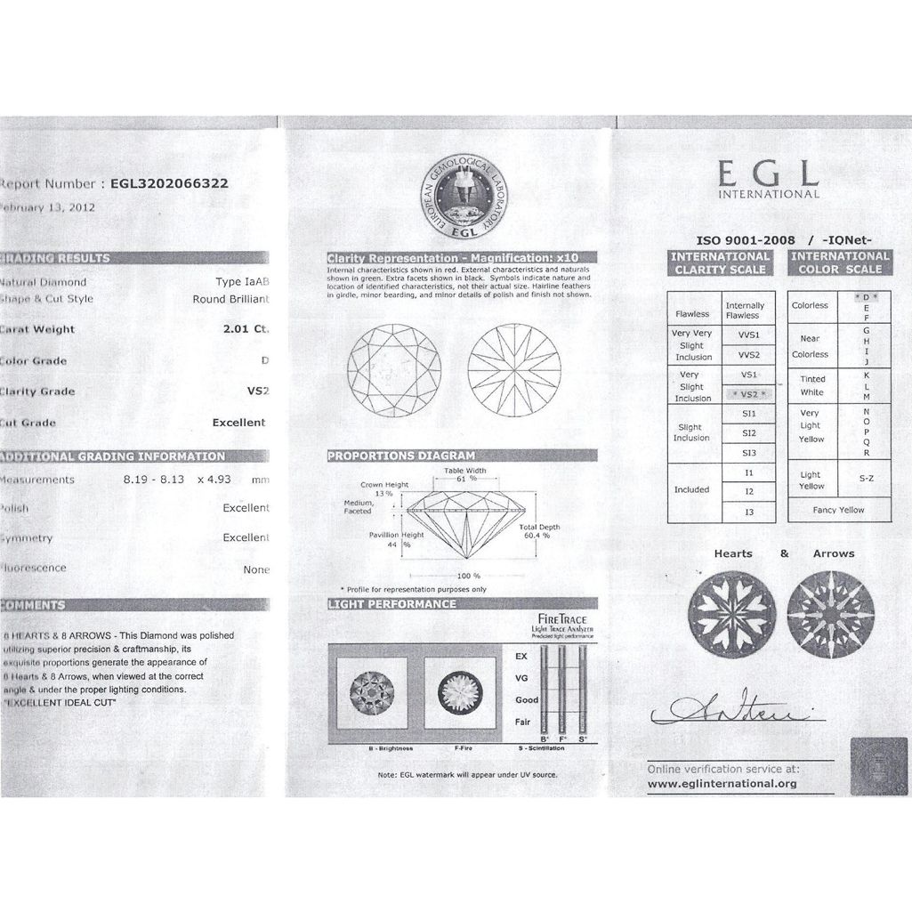 Diamond EGL Cert. ID: 3202066322 Round 2.01 ctw D, VS2 **|**|** 8.19-8.13x4.93mm;Cut Excellent; Polish Excellent; Symmetry Excellent; Fluo None; Depth 60.4%; table61% ; MSRP: $72000