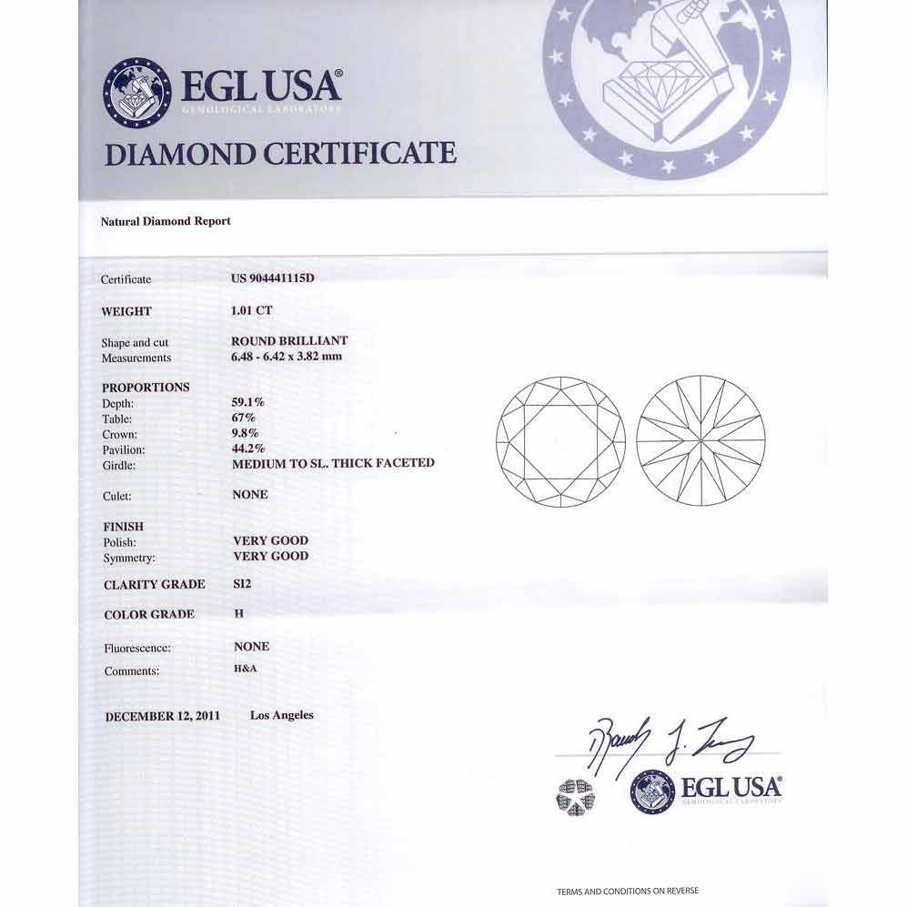 Diamond EGL Cert.ID:93538509D Round 1.01 ctw E, SI2 **|**|** 6.45x6.41x3.92mm;Cut Very Good; Polish Good; Symmetry Very Good; Fluo None; Depth 42.9%; table 60% ; MSRP: $24840