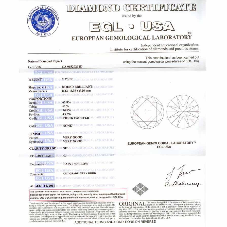 Diamond EGL Cert.ID:96529202D Round 2.37 ctw G, SI2 **|**|** 8.42x8..35x5.26mm;Cut Very Good; Polish Good; Symmetry Very Good; Fluo Faint Yellow; Depth 62.8%; table 61% ; MSRP: $34560