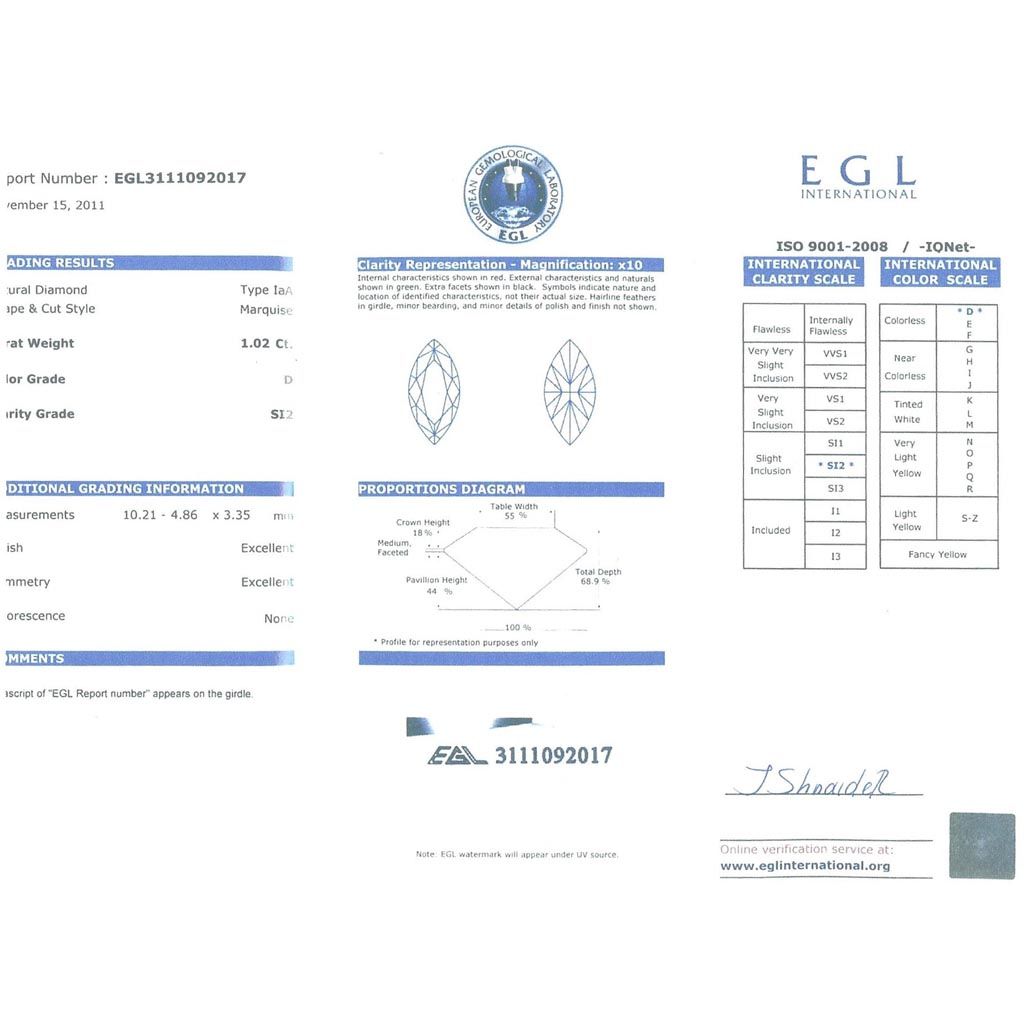 Diamond EGL Cert. Marquise 1.02 ct D, Si2 **|**|** 10.214.86x3.35mm;Cut Excellent; Polish Excellent; Symmetry Excellent; Fluo None; Depth 68.9%; table 55% ; MSRP: $11000